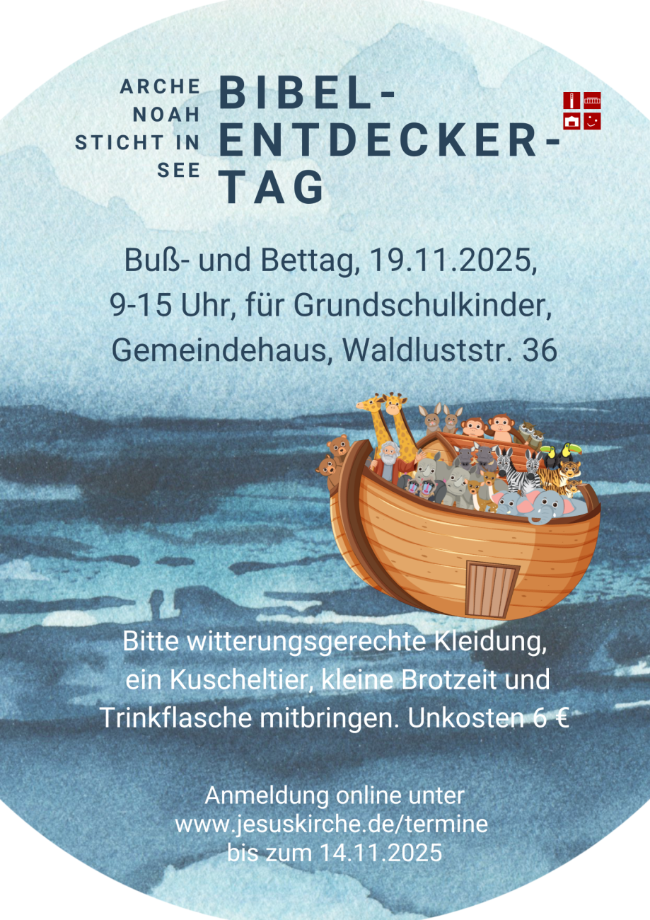 Von 9-15 Uhr, Gemeindehaus, Waldluststr. 36, wollen wir unter dem Motto "Arche Noah sticht in See" gemeinsam Zeit verbringen, basteln und spielen.