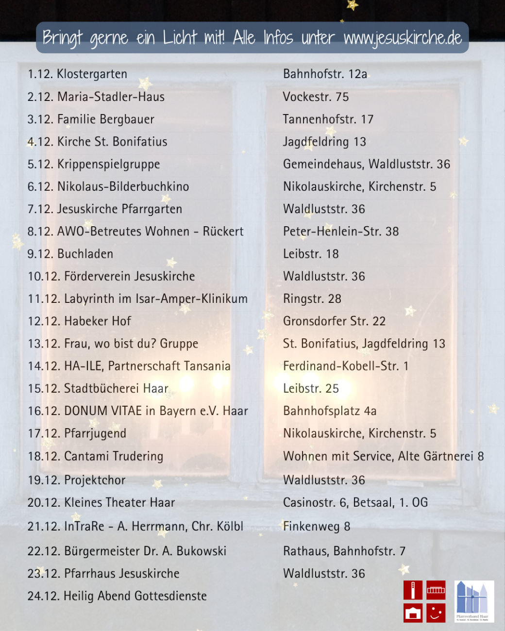 Ort: Gemeindehaus der Jesuskirche, Waldluststr. 36, 85540 Haar. Anmeldung nicht zwingend, aber erbeten an: Pfarrerin Johanna Imhof, johanna.imhof@elkb.de oder Tel. 089/32497716